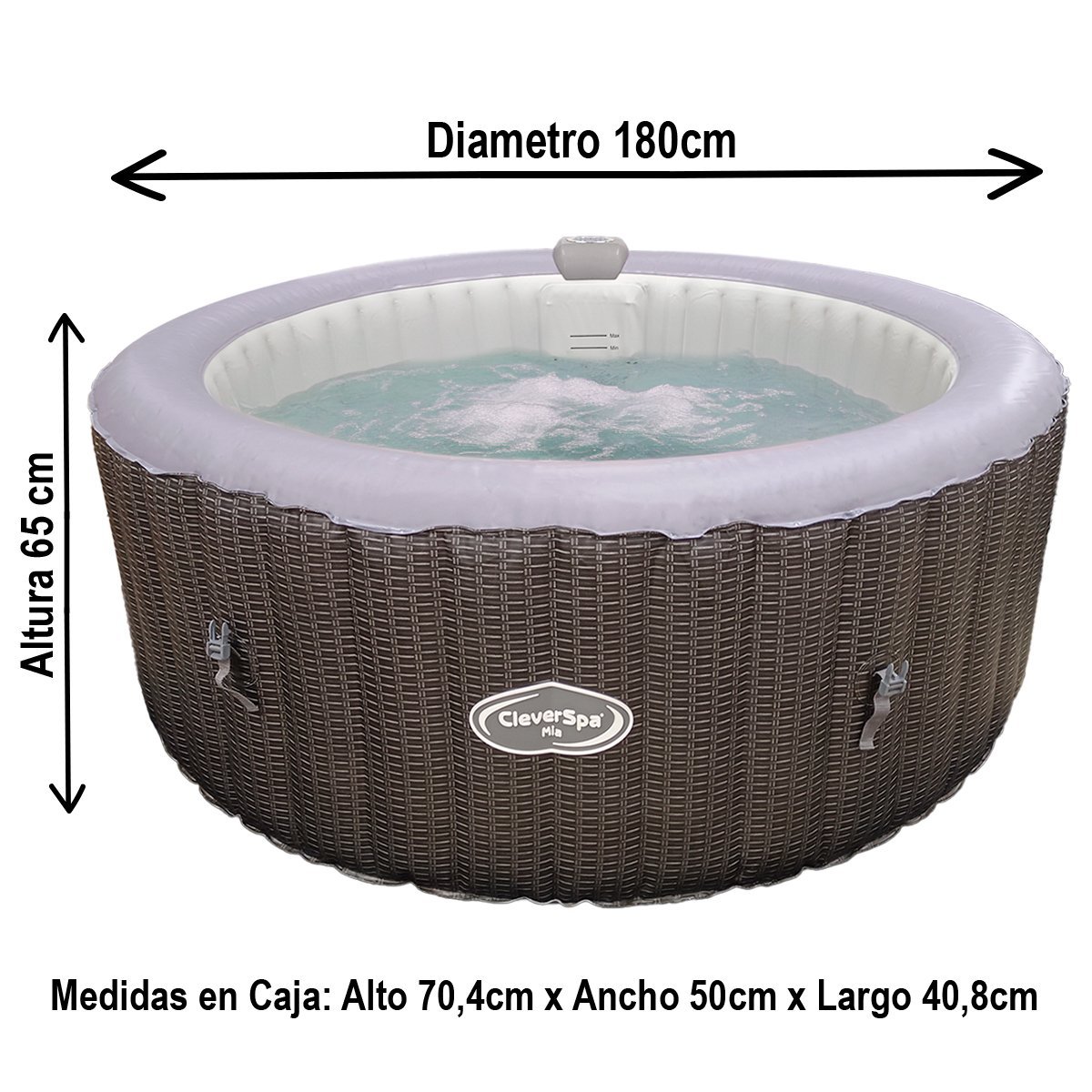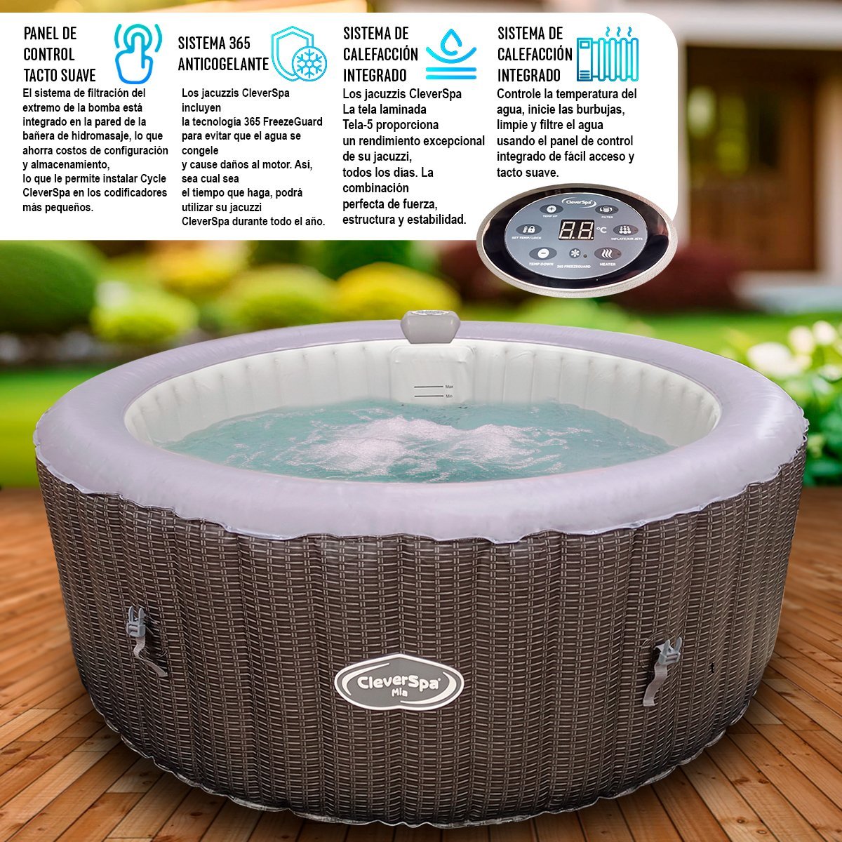 - Características excepcionales: 110 chorros de aire, bomba y sistema de calefacción integrados, diseño duradero, fácil manejo, portabilidad y protección contra heladas.
